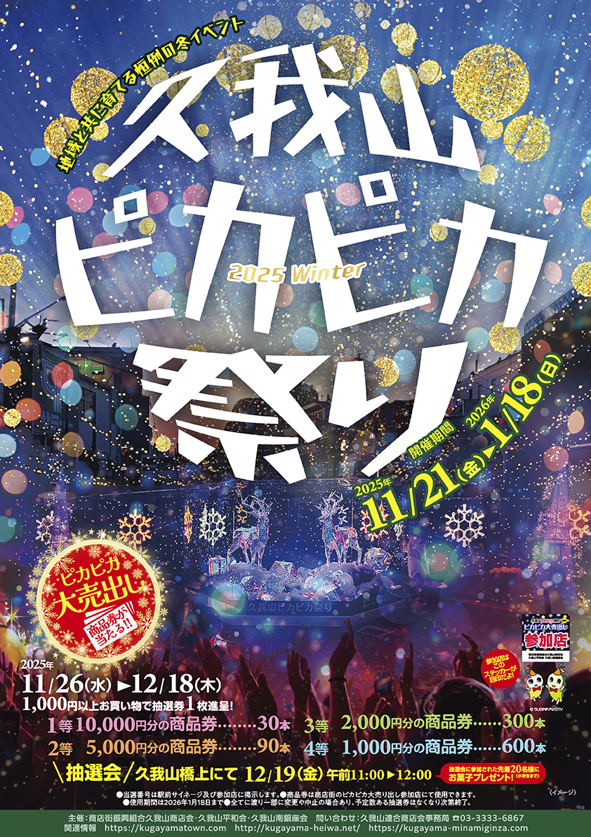 また、2025年11月26日~12月18日までは「ピカピカ大売出し」も開催!商店街の参加店で1,000円以上お買い物をすると、抽選券を一枚進呈いたします。(抽選会は12月19日AM11:00~12:00久我山橋上)