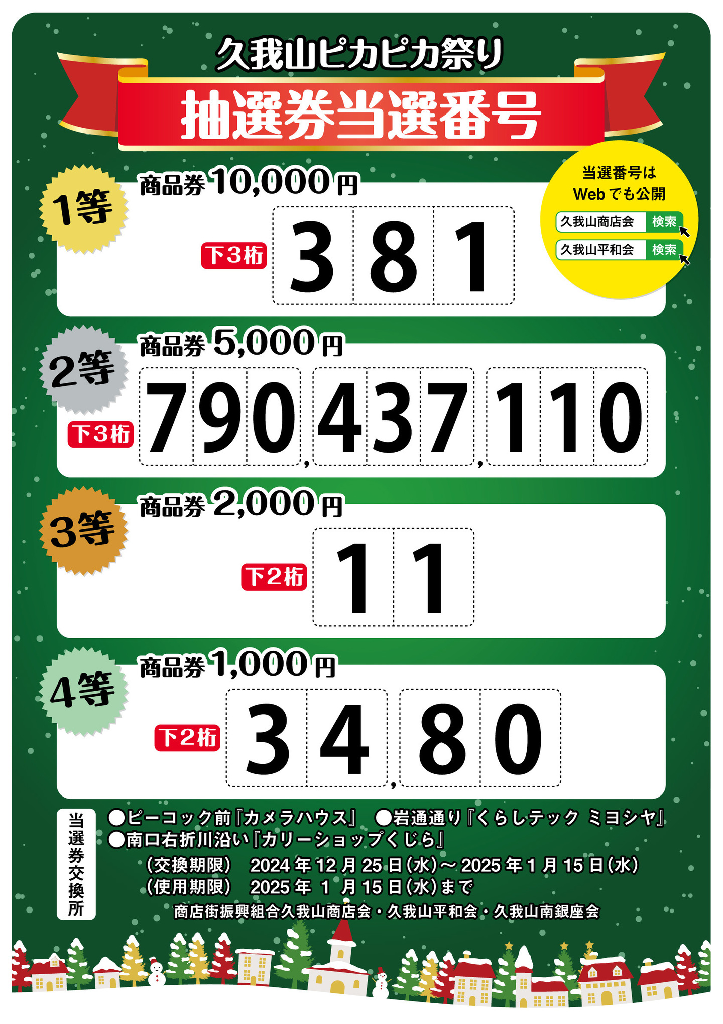 ご当選された方は、上記の商品券交換店にて「抽選権」を「商品券」へ交換しお願いいたします。商品券の使用は、ピカピカ大売出し参加店で使用可能す。